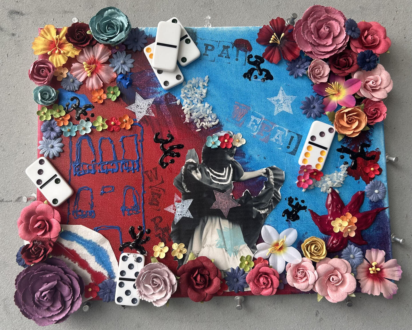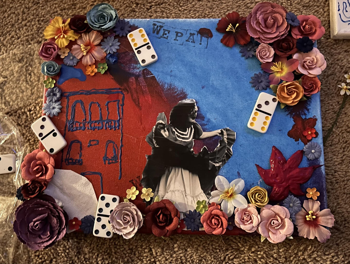 When starting this piece, I knew I wanted a lot of texture and variety, but I was overwhelmed and didn't have a clear goal in mind. When reflecting back on Puerto Rican culture I considered the aspects and items that I and my family often use or see. I knew that I wanted to have lots of floral detail and I wanted to paint my favorite sights within San Juan. I figured out from the beginning that I wanted to include a typical house that you'd see in San Juan and I wanted to include a bomba dancer in grayscale. Once I knew those key aspects, I thought about other items and culturally significant elements of Puerto Rican Culture.When researching different patterns and techniques I felt really inspired to include impasto texture. I was very satisfied with my impasto flower, coqui, and building design. The more I thought about home the more ideas of elements and aspects came to mind. I wanted the piece to be loud and slightly chaotic because every single family event I've ever been too has always been loud, hearty, and colorful. So to showcase that rhythm in my piece I've utilized lots of overlapping and color variety. I tried to not have too many repeating patterns because I wanted my piece to be unique.