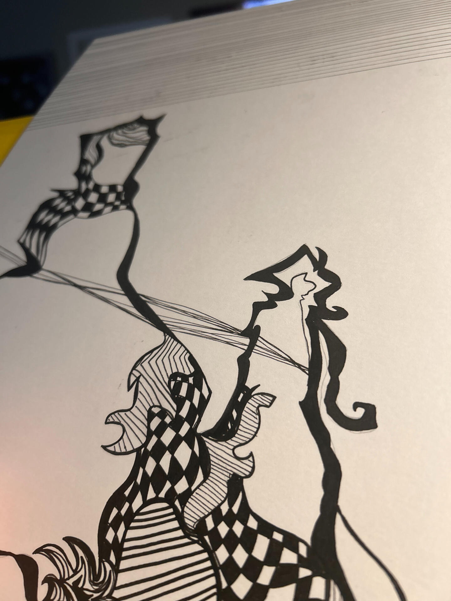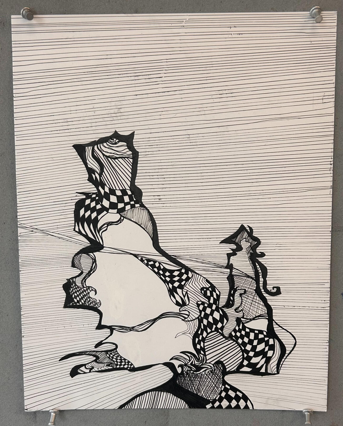 My inspiration for this piece was The Strokes album Angles. My source image was Mercury Lulling Argus to Sleep. I really enjoyed the checkered pattern and I wanted to have lots of silly lines. This piece is meant to show the mind when listening to music. Whenever I listen to music or feel strong physical sensations (like piercings) my brain will make patterns and lines just like this. I started with an outline of my boldest outline, then the rest was just in pen no sketch.I loved having the negative space as my focal point and having lots of lines in the background. It feels a lot like how my brain works. This isn't very different from my usual process since I often pen sketch. This work reminds me of a younger version of myself because I would love getting new microns and I truly felt like a real artist when I used them.