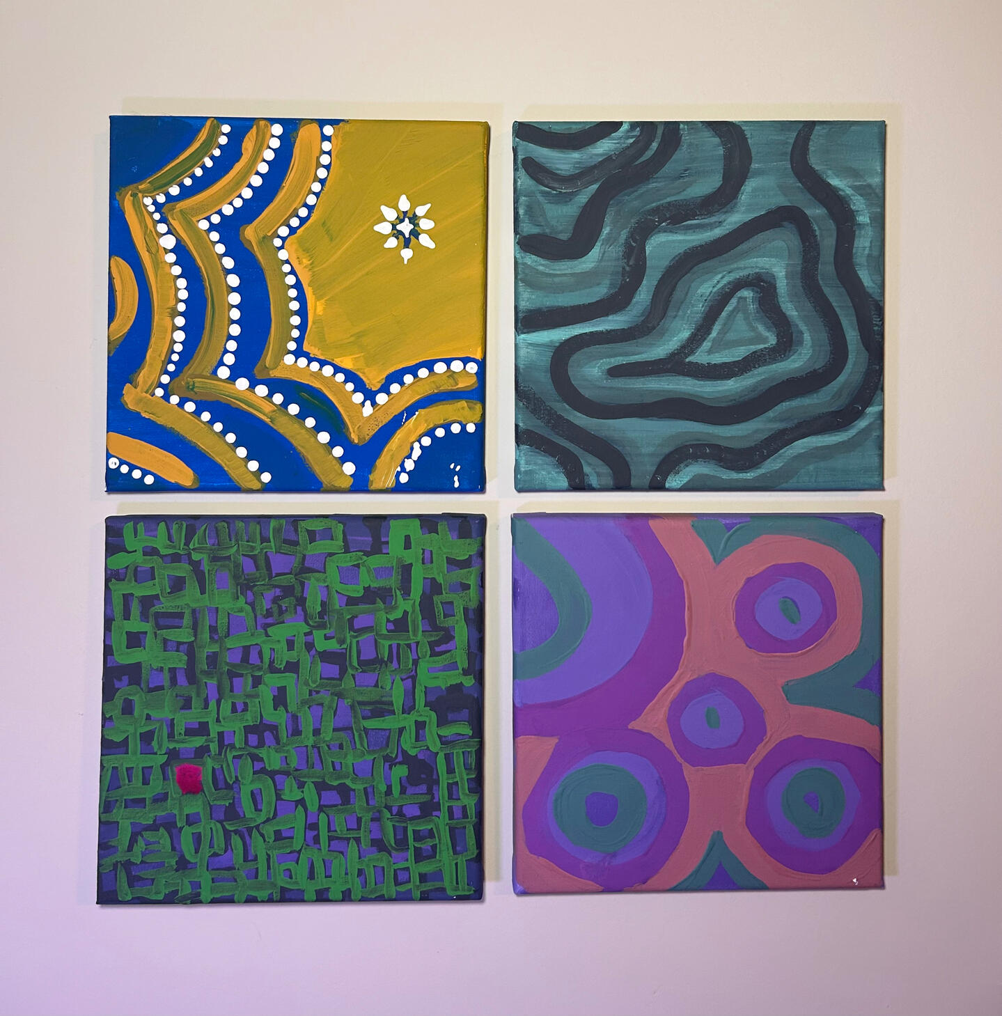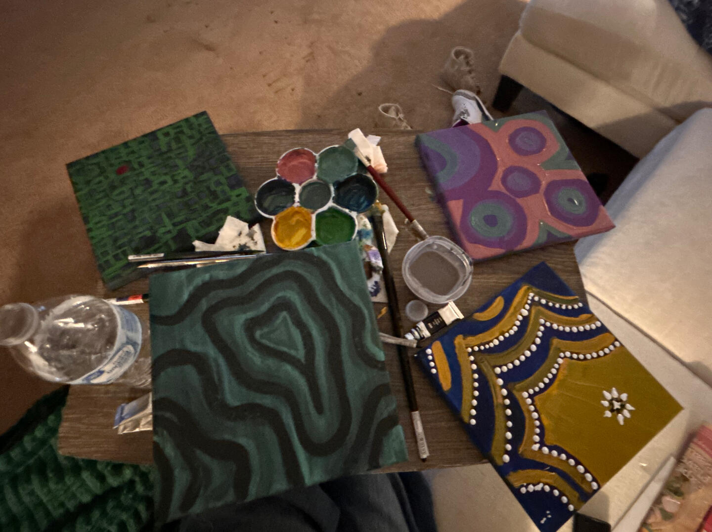 This piece was based on my experience leaving my NJROTC unit that I was part of for all four years of highschool. I was the Commanding Officer my senior year, which meant I had a lot of responsibility. Whenever I left, I was overjoyed and relieved that my responsibilities were finally over. The first two canvas represent the bliss and relief. I wanted high contrast with relief to show just how exhausted and stressed I was while in it, and how refreshed I was to leave. My last two canvas were guilt and melancholy. I used a split complimentary palette with guilt and an analogous palette with melancholy.