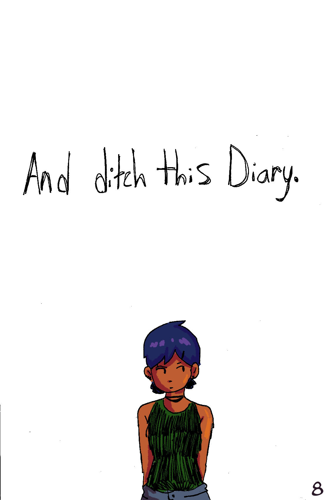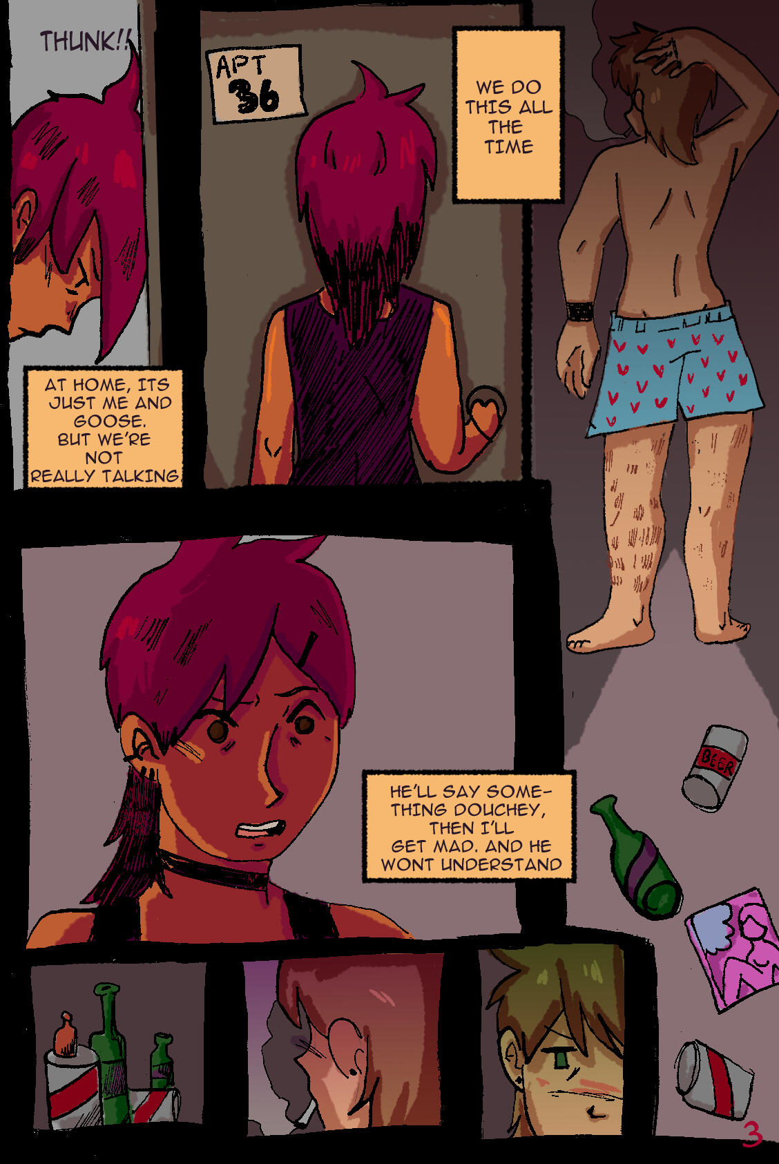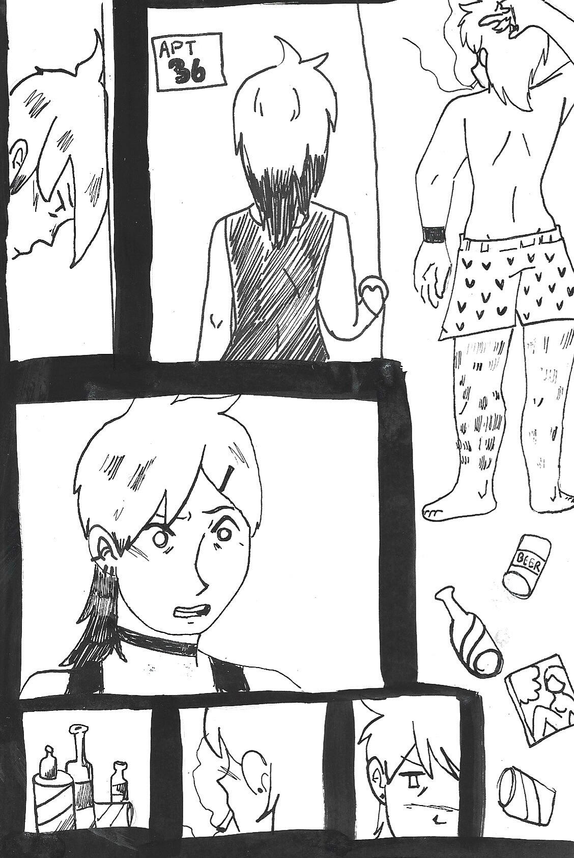 I was inspired to create a story that wasn't just a normal comic. I wanted all audiences to be able to read this story and feel captivated since it's not too fantastical or too metaphoric. I also wanted to find a way to tell this girls story in a way that is upfront, so I figured, a diary makes the most sense.I wanted it to highlight an argument between her and her boyfriend because I was eager to practice my dialogue and expressions. Since I focus on character art almost exclusively, I rarely really spend time researching or studies how to incorporate backgrounds into a comic setting, so I kept my background simple. I don't believe it impacts the narrative of the story since we aren't focused on her settings, but rather her relationships with her boyfriend and herself.I would say this story does have a deep meaning but the meaning is obvious since it's pretty much stated. My girl is obviously not a perfect girlfriend, just like how goose isn't a good boyfriend. The showcase of complexity within a relationship and how that can affect your perception of yourself is very clearly showcased in this piece. This work shows my digital coloring abilities, my expressions, character design and writing, as well as my ability to work on an intense time crunch. Since I got this printed, I had to turn it in a week early to the printers. This piece is a large accumulation of skills. It showcases my ability to write, color different scenes, facial expressions, and character relations.I'm incredibly proud with how I completed this comic with the additive challenge of drawing it all by hand then importing it digitally to only color.